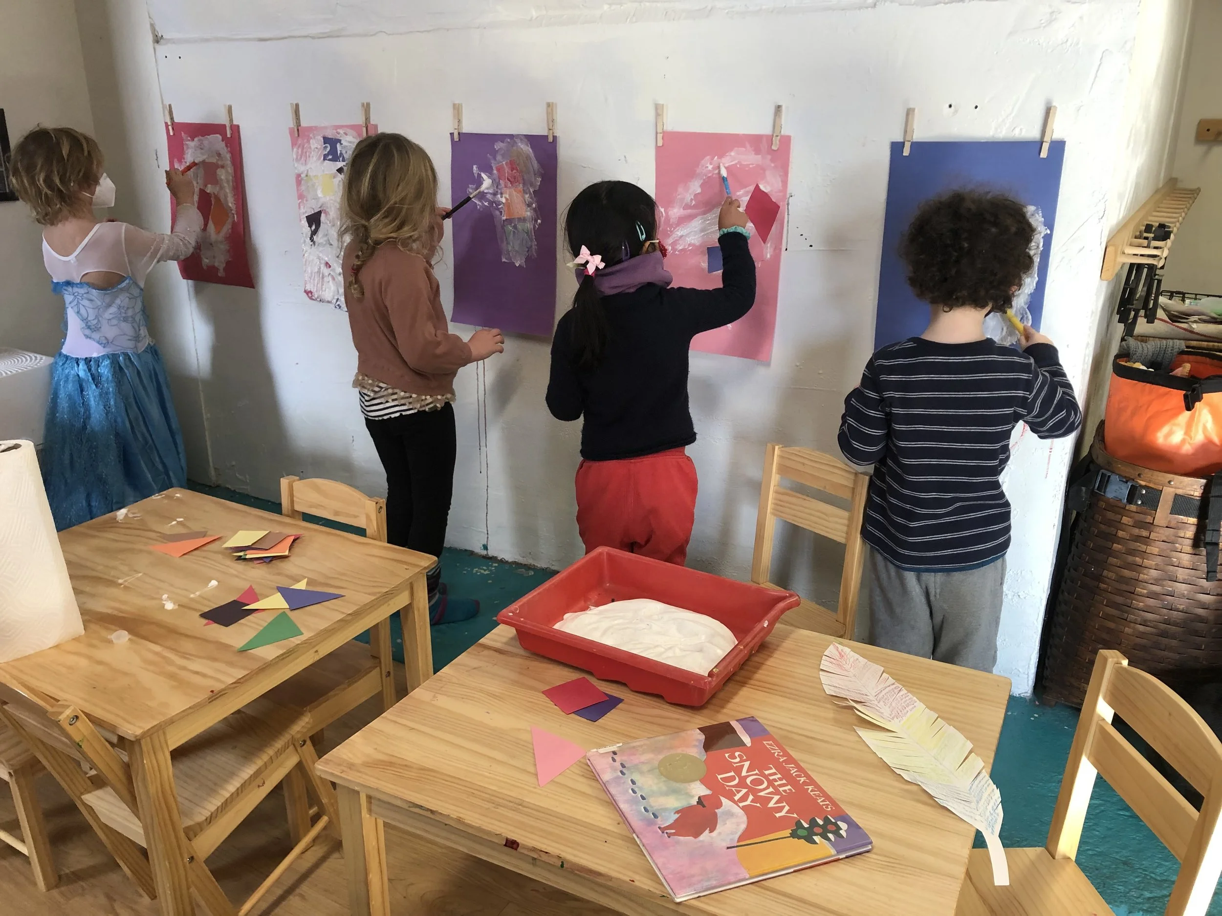 On Thursday we make fruit popsicles (which didn't freeze fully by the end of the day so we will eat them on Monday), and read The Snowy Day. We had a snow adventure and played in the giant snowbank out front. Roan and I had dug a tunnel on Wednesday afternoon that they all climbed through, and then we all worked together to dig a new tunnel. It was pretty exciting. Many of us knew the Winnie the Pooh story where he gets stuck in Rabbit's doorway after eating too much honey, and this became an impromptu game in the tunnels. Then we went inside and talked about colors and shapes, and made some sparkly, puffy paint pictures inspired by Jack Ezra Keats' illustrations in The Snowy Day. A fun week!